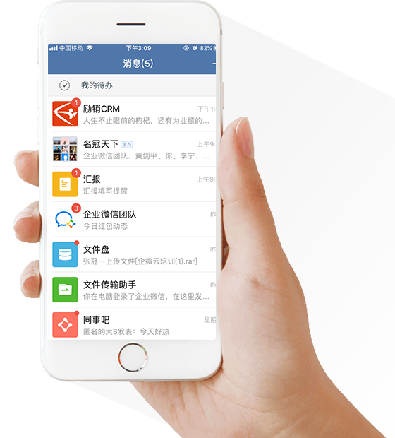 成员可在微信中接收企业通知连接微信支付、公众号等微信功能。且与微信消息互通正在开放内测